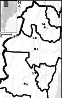 los asentamientos mencionados en el texto. Referencias: 1: Los Amarillos; 2: