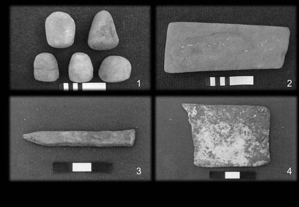 Los Amarillos. Referencias: 1: Martillos; 2: Yunque; 3: Artefacto sin terminar;