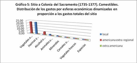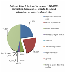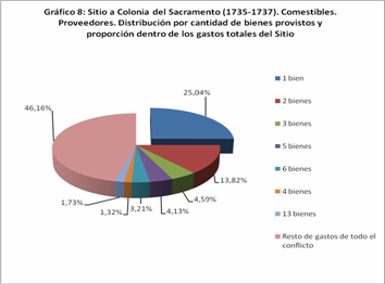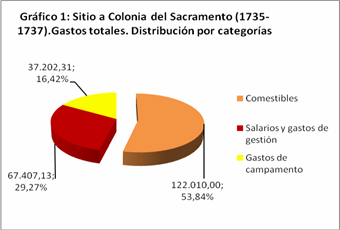 Observamos que la comparación de ambas cifras demuestra que la suma que los capitales privados del comercio se llevaron durante el sitio es muy cercana al valor gastado en defensa por la Monarquía; además, ese dinero que la Corona no se llevó, era dinero que quedaba mayormente en estos territorios, dinamizando la economía. Los gastos generales del sitio, como se observa en el cuadro 1, fueron divididos en tres categorías entre las cuales la de comestibles duplica a las restantes.