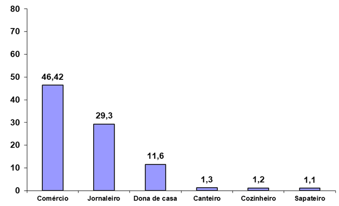 De los gallegos que vivieron en el barrio de Santo Antônio, la mayoría de ellos trabajó en el comercio (67,2%). No tenemos cómo comprobar en qué tipo de comercio, ya que prevalecen las definiciones de carácter más general, como “negociantes” y “empleados”. Sin embargo, nos arriesgamos a vincular la profesión de los emigrantes con el sector de la hotelería, no sólo por las declaraciones de los entrevistados, sino también por las características del propio barrio, dotado de restaurantes y pensiones. Esto no excluye, por supuesto, el comercio minorista.