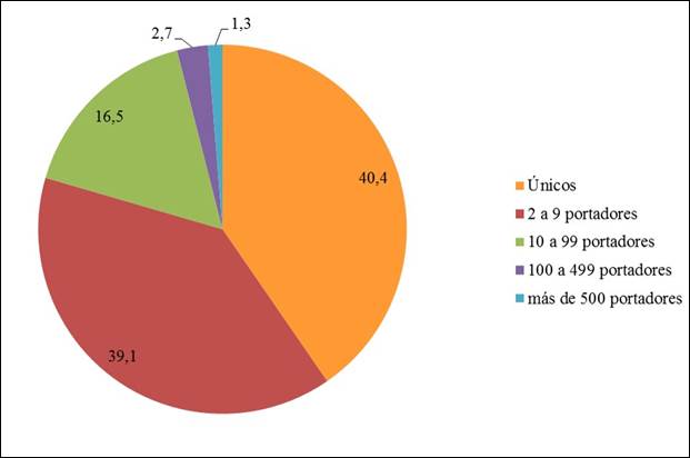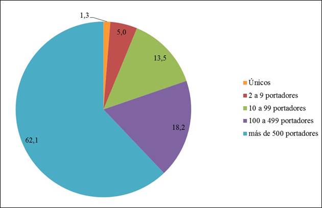 Se trabajó con el Padrón electoral[8] de la provincia de Salta para 2001, proporcionado por la Cámara Nacional Electoral. Los apellidos de varones y mujeres, tomados de manera conjunta, fueron analizados tal como estaban registrados, en el caso de tratarse de apellidos dobles sólo se consideró el primero. El origen de los apellidos se estableció en base a criterios geográficos y lingüísticos, y para cada una de las categorías consideradas se determinó el porcentaje de apellidos sobre el total y el de portadores sobre la población completa. Los apellidos fueron agrupados por rangos según la cantidad de representantes de cada uno en: únicos (1 solo individuo), de 2 a 9, 10 a 99, 100 a 499 y más de 500 portadores[9].