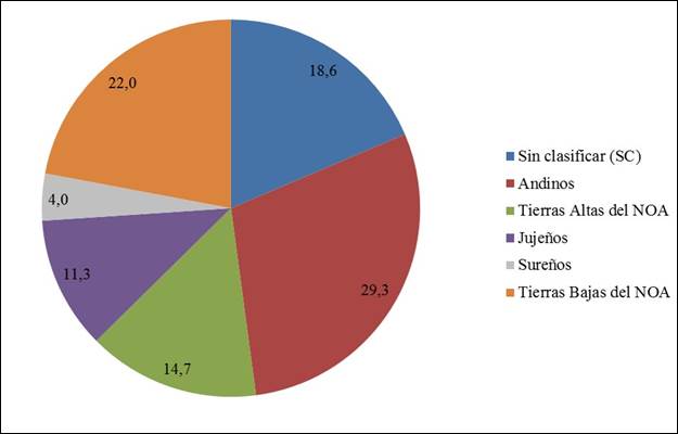 Los apellidos autóctonos fueron sub-clasificados según su origen geográfico en Andinos (Bolivia, Chile, Perú y Ecuador), Jujeños (apellidos registrados en documentación colonial de la Puna de Jujuy y Quebrada de Humahuaca entre 1557 y 1786), Tierras Altas del Noroeste Argentino (incluidos en documentos históricos del sector andino de Salta, Catamarca, La Rioja y Tucumán), Tierras Bajas de Noroeste Argentino (Santiago del Estero y tierras bajas de Salta, Jujuy y Tucumán), Sureños (que incluyen antropónimos registrados desde la provincia de Córdoba y San Juan hacia el Sur) y Sin Clasificar. Se considera la categoría “Jujeños” como un grupo significativo, en tanto se viene analizando este conjunto desde hace tiempo para la clasificación de los apellidos de la provincia de Jujuy[11] y por no contar con investigaciones análogas para la provincia de Salta.