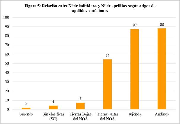 Los apellidos autóctonos más frecuentes en Salta se hallan dominados por andinos y en segundo lugar por los clasificados como “Jujeños”, ambas categorías comprenden apellidos de origen polifilético. Los correspondientes al espacio geográfico de la provincia de Salta (Tierras Altas del NOA) aparecen en tercer lugar, tal vez por los traslados compulsivos de la población durante la época colonial. Para éstos no ha sido posible definir si su origen es mono o polifilético.