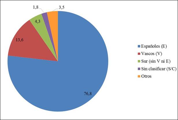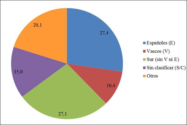 Figura 6: Porcentaje de individuos según región de procedencia de apellidos foráneos, discriminando españoles y vascos.