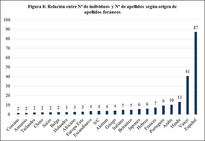 Figura 8: Relación entre Nº de individuos y Nº de apellidos según origen de apellidos foráneos