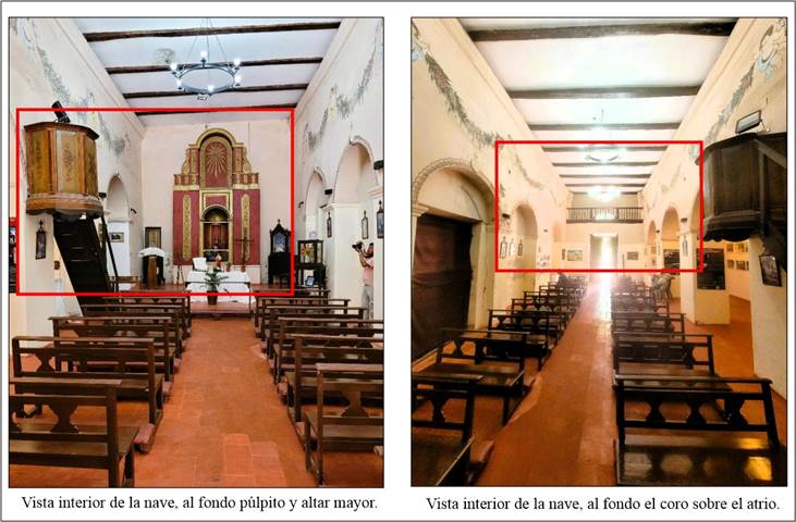 La iglesia es de estilo colonial clásico. Posee una nave única, alta y angosta de 10 m de ancho por 21 m de largo. La nave central que mide 6,30 m de ancho por 17,5 m de largo. En el lado sur de la iglesia se abre una pequeña nave secundaria (4,10 m de ancho x 12,70 m de largo) que se continúa con la sacristía hacia el oeste y con el acceso al coro hacia el este. La circulación de un espacio a otro se realizó a través de columnas cuadradas sin basa y con un capitel compuesto por moldura muy simple de estuco que sostienen un arco abovedado de medio punto apoyado sobre impostas (Figura 5). En total, la nave posee cuatro columnas completas y cuatro medias columnas que se replican en espejo hacia el lado norte de la iglesia. Las mismas se encuentran adosadas al muro sobresaliendo sólo una sección de las ellas, como así también del arco (Figura 8). Las columnas que actúan como divisorias de espacios son de sección circular de 60 cm de diámetro, construidas con mampostería que sostiene un arco de medio punto.  El arco está compuesto por una serie de piezas denominadas dovelas de ladrillos de barro que trabajan a compresión (Huerta, 2004).