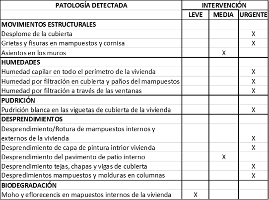 Con respecto al análisis de patologías, se llegó a la conclusión que el problema principal que presenta el conjunto arquitectónico es la humedad por filtración a través de la cubierta y la existencia de grietas debido a la ejecución incorrecta de algunos mampuestos, la falta de mantenimiento del mismo, la eliminación de bajantes de pluviales y el crecimiento de plantas en mampuestos. Por otra parte, la pérdida de parte de cubierta superior ha favorecido su deterioro y como consecuencia a la filtración de agua en el interior de la vivienda. En virtud de ello, se recomienda que la cubierta de la edificación se intervenga con carácter de urgencia. La humedad por capilaridad es otro factor que actúa negativamente en la conservación de la vivienda.