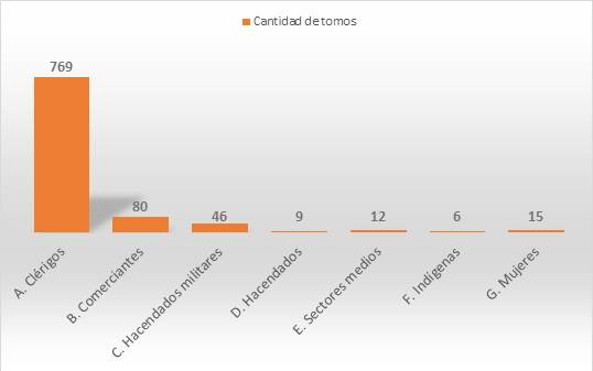 A.- El grupo que más libros reunió, por obvias necesidades profesionales, fue el de siete clérigos con 769 volúmenes; sin embargo, más del 70% de estos (550) pertenecieron solo a dos: los doctores Juan Pascual Bailón Pereyra -con una de las bibliotecas privadas más grandes del Tucumán de entonces: 279 libros-, y Diego Antonio Martínez de Iriarte con 271 volúmenes. Este último, presbítero y abogado, descendía de una familia vasca que, afincada en Córdoba a principios del siglo XVII, se le concedió una encomienda en las jurisdicciones de San Miguel de Tucumán y en Jujuy (Zenarruza, 1991: 394). Su padre, el general Diego Tomás, también encomendero de una parcialidad de los ocloyas, desde 1750 pasó por los puestos de alcalde capitular y teniente de gobernador, entre otros (Cruz, 2015: 129-131). La familia, perteneciente al patriciado mercantil, estableció redes que le permitieron gozar de una posición económica favorable, estrechando lazos con la Iglesia, como sucedió con la estancia de Perico, adquirida por el bisabuelo de Diego Antonio, que luego sería viceparroquia y se constituiría como curato en 1773 (Cruz, 2010: 120; Vergara, 1942: 105-106).
