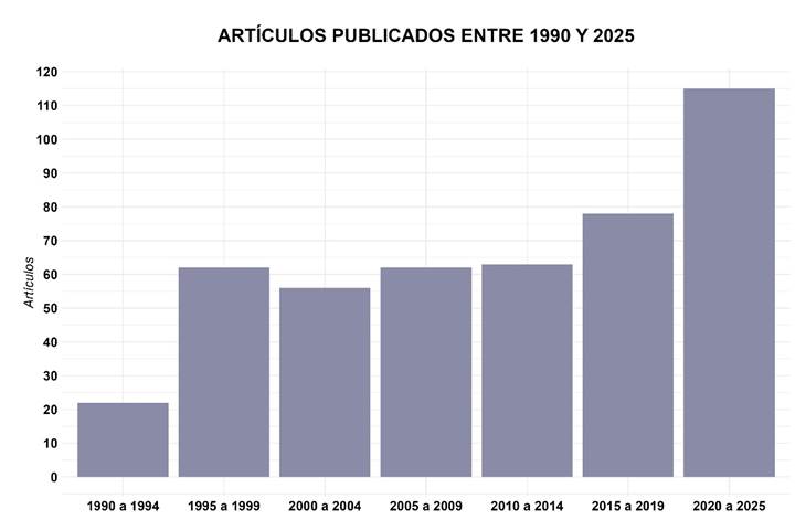 Cantidad de artículos publicados en la revista Andes entre 1990 y 2025.