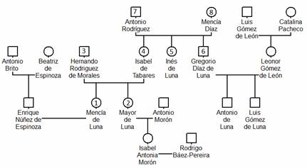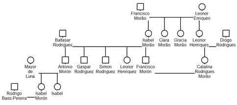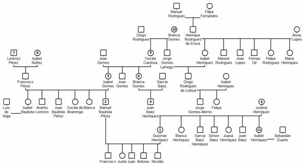 Pero, ¿de qué hablan actualmente los investigadores cuando hacen referencia al fenómeno de la endogamia entre los cristianos nuevos portugueses? En realidad, y en este contexto, aquello que es sindicado como endogamia puede hacer referencia, al menos, a tres aspectos diferentes: 1) en algunas ocasiones, endogamia, aparece como la elección matrimonial efectuada al interior de relaciones de consanguinidad al mismo tiempo que de afinidad en las prácticas religiosas judaizantes; 2) en otras, el término puede ser entendido como alusión a la elección de cónyuges con antecedentes cristianos nuevos (judaizantes o no) sin que se trate de uniones consanguíneas[16]; 3) por último, también se ha de considerar, en un sentido amplio, la tendencia a la elección de parejas al interior de un mismo círculo nacional, en este caso entre otros miembros de la nación portuguesa[17]. Para todas estas variantes de endogamia en un sentido lato poseemos ejemplos al interior del grupo que nos ocupa.