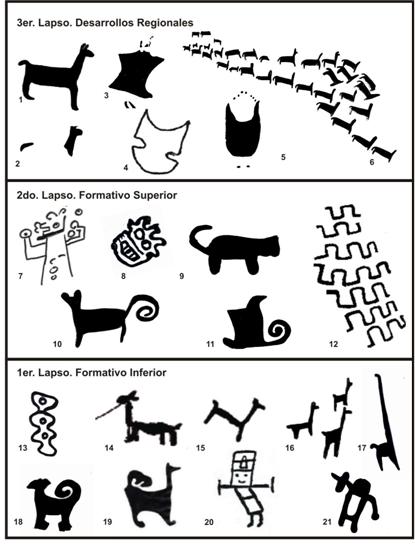 [85] 1) Patrón C1, SSALCAF 9; 2) Patrón C10b, SSALCAF 19; 3) Patrón F4, SSALCAF 19; 4 y 5) Patrón F5, SSALCAF 16 y SSALCAF 19; 6) Tema 1, alineación simple de camélidos, SSALCAF 19; 7) Patrón F1, SSALCAF 9; 8) Patrón F6, SSALCAF 16; 9) Patrón Fe3, SSALCAF 19; 10) Patrón Fe2, SSALCAF 19; 11) Patrón Fe1, SSALCAF 19; 12) Geométrico SSALCAF 16; 13) SSALCAF 16; 14) Patrón C8, SSALCAF 16; 15) Patrón C5, SSALCAF 16; 16) Patrón C4, SSALCAF 9; 17) Biomorfo, SSALCAF 16; 18 y 19 ) Biomorfo, SSALCAF 9; 20 y 21) Patrón F2, SSALCAF 16