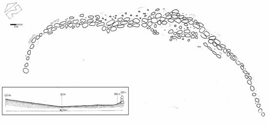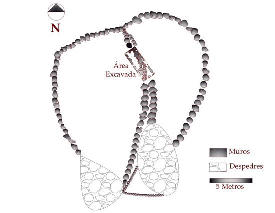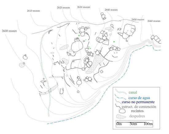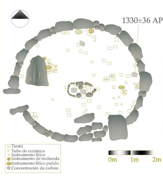 [35] Realizamos esta afirmación a partir de los siguientes indicadores: técnicas arquitectónicas análogas a las estructuras residenciales fechadas por C14 entre 600 y 1000 A.D.; predominio casi absoluto de fragmentos no decorados -sólo se presentan algunos tiestos con incisiones punteadas- de pasta gruesas cocidas en atmósfera oxidante, con la presencia de una capa de engobe rojo, frecuentemente pulidos y, en menor medida, cerámica alisada de textura fina y compacta de color beige, tipos pertenecientes a los conjuntos cerámicos propios del primer milenio en el valle (sólo en la superficie se registraron dos fragmentos con decoraciones pintadas en negro sobre blanco, que se podrían asociar al estilo “Santamariano bicolor”, propio de momentos posteriores); tubo de cerámica (¿pipa?); azada lítica pulida.