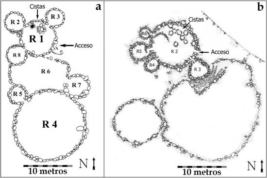En los recintos menores, que posiblemente eran techados en su totalidad[27], se han detectado rasgos internos –en especial fogones y deflectores- y gran diversidad de artefactos –fragmentos de vasijas de cerámica de diversos tamaños y formas, manos de moler, instrumentos líticos, pipas, etc.- han sido interpretados como lugares de descanso o de realización de actividades específicas, que se fueron agregando a los conjuntos arquitectónicos, a medida que las unidades domésticas se ampliaban.