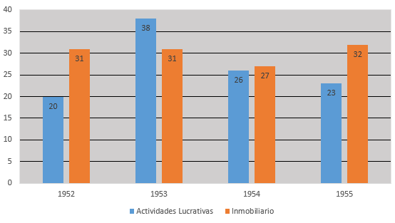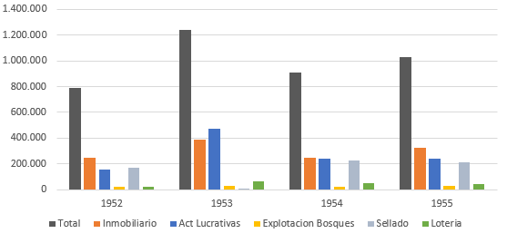 1949 Contribución territorial: 27 %. Patentes: 27 %. En 1951 Contribución