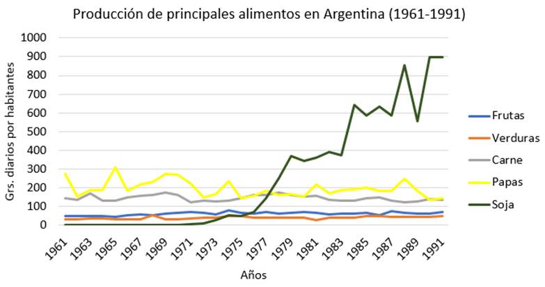 Hay una escasa modificación en los niveles de producción y consumo de los alimentos analizados, como efecto del patrón alimentario unificado. Las abruptas variaciones en el consumo de papa se pueden explicar por la importancia como alimento rendidor en las dietas restringidas características de los sectores más pobres.[23] La producción de la soja a partir de 1976 cobra mayor importancia superando rápidamente a la producción de carnes y papas. Sin embargo, en el gráfico de consumos este alimento no aparece ya que no llega, ni siquiera, a 1 kg por año. Esta dinámica de producir un alimento que no tiene recepción en el mercado interno y es pensado sólo para su comercialización en el mercado mundial será más relevante a partir de los 2000 debido a sus distorsiones en la oferta alimentaria y a que desde 1996 se habilita la soja transgénica. Para este período las reducciones en el consumo tienen esencialmente una explicación económica, es decir, es una variable dependiente de la capacidad de compra de los consumidores y no es producto de modificaciones en la oferta alimentaria. Hay una correspondencia entre lo que se produce y lo que se consume. Existen alimentos disponibles, como ya se dijo. No hay problemas en la oferta alimentaria pero sí en la accesibilidad generado por las condiciones económicas.
