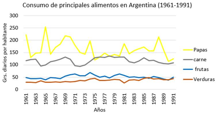 A inicios del período analizado, el consumo del tubérculo se encuentra a una distancia considerable del de la carne, en término de gramos consumidos por persona al día. No obstante, a medida que avanza el calendario esta distancia se va reduciendo. Al punto que en 1988 el consumo de papas supera al de la carne y para 1989 quedan separados por muy pocos gramos. La comparación entre estos alimentos resulta relevante. La papa es un componente central en las dietas restringidas. La carne es un representante de la cultura alimentaria argentina que suele encabezar los aumentos de alimentos frescos por detrás de las frutas y de las verduras. La relación entre estos dos alimentos da una buena perspectiva de la situación económica y social del país. Relación que sugiere que, a mayor cantidad de carne y menor cantidad de papas consumidas, mejor sería la situación y más nutritiva la dieta. La situación se debe a que el consumo de papas aporta carbohidratos mientras que el de la carne nutre con proteínas al organismo. Esta relación se mantiene al menos hasta los 2000, donde diversos procesos ya mencionados en secciones anteriores afectan la oferta y el acceso a los alimentos.
