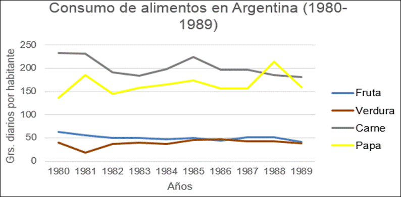 El gráfico presenta la evolución del consumo de ciertos alimentos desde 1980 hasta el final del mandato de Raúl Alfonsín. La elección de los alimentos no es azarosa, representan los principales alimentos frescos esenciales para una alimentación saludable de acuerdo a las Guías Alimentarias para la Población Argentina (GAPA). Estos son, carnes, frutas y verduras. En este gráfico también se presenta la agrupación en categorías realizadas en los anteriores esquemas, carne (vacuna y pollo), frutas (naranjas, mandarinas, manzanas y bananas) y verduras (cebolla y tomate).