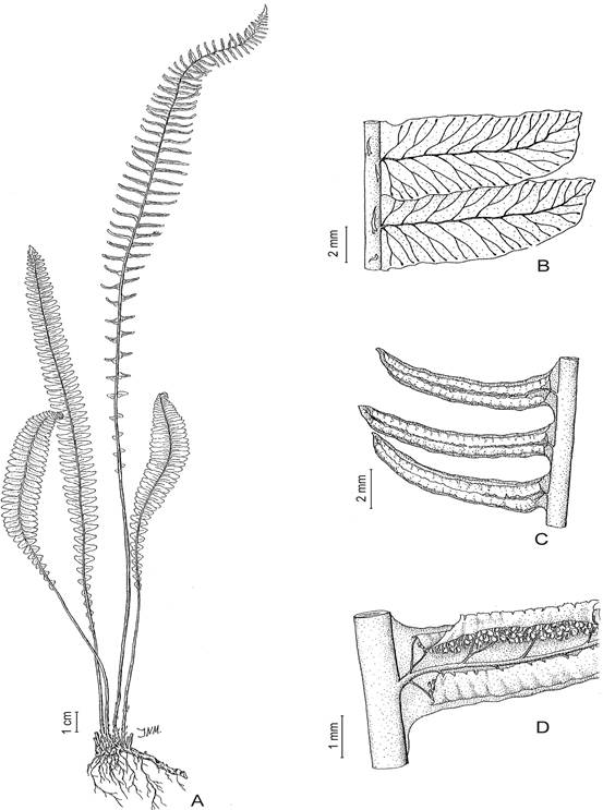 Figura 1. Austroblechnum penna-marina. A. Planta completa. B. Detalle de la nerviación de una pinna estéril. C. Pinna fértil. D. Detalle de cenosoros en pinna fértil. De Fl. Pcia. Jujuy 2: 251.