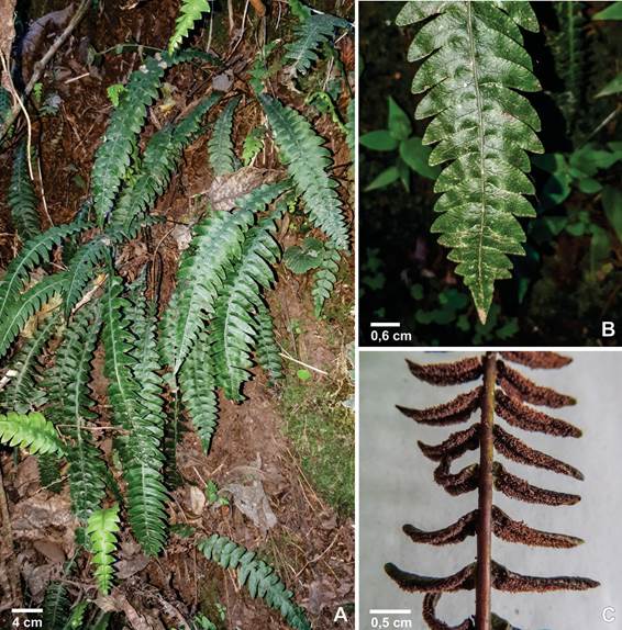 Figura 5. Blechnum occidentale. A. Aspecto general de la planta. B. Fronde estéril joven. C. Detalle de pinna fértil mostrando cenosoros. Fotos: J. Chambi.