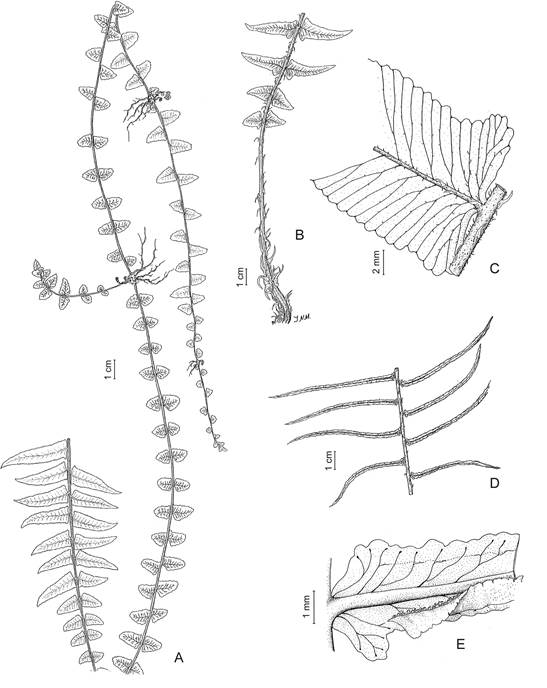 Figura 6. Cranfillia caudata. A. Porción terminal de una fronde mostrando raquis con yema prolífera. B. Pecíolo y base de la lámina. C. Base de una pinna estéril. D. Pinnas fértiles. E. Mitad basal de pinna fértil con detalle de nervaduras y ubicación de cenosoro e indusio. De Fl. Pcia. Jujuy 2: 255.