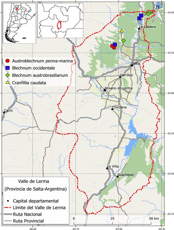Figura 7. Distribución de las especies de Blechnaceae en el Valle de Lerma (Salta, Argentina).