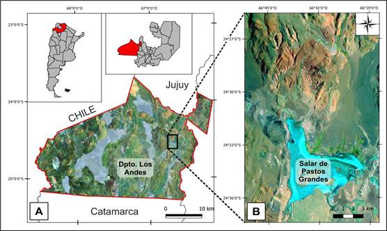 Figura 2. A. Ubicación geográfica del salar de Pastos Grandes en el departamento Los Andes indicado en