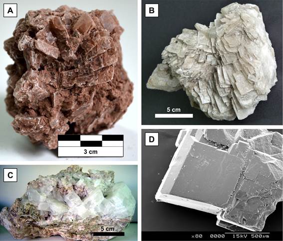 Figura 4. Imágenes de muestras de inyoíta. A. Inyoíta en cristales de hábito tabular. Formación Blanca Lila. Salar de Pastos Grandes, departamento Los Andes, Salta, Argentina (Colector Geól. Rocío Martínez). Corresponde al “borato petrificado” de San Román (1911). B. Agregado de cristales de inyoíta con hábito tabular. Distrito Sijes, departamento Los Andes, Salta, Argentina (Colección Dr. L. F. Aristarain UNSa).