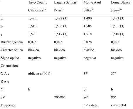 Tabla 1: Propiedades ópticas de diferentes muestras de inyoíta. (1) Schaller (1916), (2) Muessig (1958), (3)