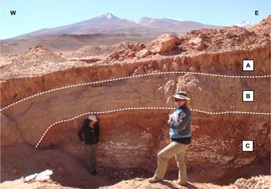 Figura 3. Vista hacia el norte de la barraca donde se encuentra el perfil de la Formación Blanca Lila des- cripto por San Román. A. Nivel de travertinos mencionados como “costra pura de concreciones calcáreas o silíceo-arcillosas”. B. Nivel de arcilla lacustre verde y yeso poroso/esponjoso con contenido de ulexita se- dosa. C. Nivel de boratos donde el “borato crespo seco” (ulexita) contiene al “borato petrificado” (inyoíta).