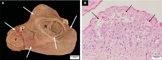 Figure 2. A. Diffuse congestion and erosions (arrows) of the rumen (R) and reticulum (r) mucosa from a treatment group goat. cardia: *. B. Hydropic degeneration cell and apoptosis (arrows) with multifocal intercellular edema.