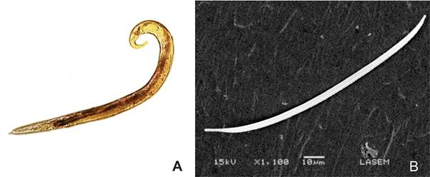 Figura 1. Strongyloides stercoralis. A. aspecto microscópico con microscopio de luz. B. vista con microscopio electrónico de barrido.