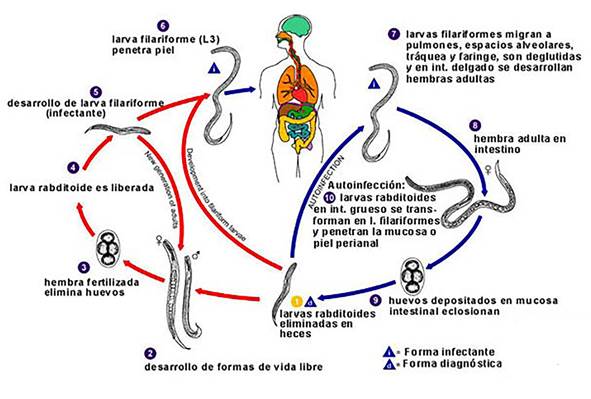 La particularidad que tiene la biología de S. stercoralis, que lo diferencia de los demás helmintos, es que tiene un ciclo de vida que involucra el suelo (vida libre) y otro de autoinfección dentro del humano, esto permite perpetuar la infección (Fig. 2). Otra diferencia es que es el único helminto que se libera como larva en la materia fecal, los demás se liberan como huevos. Esta liberación es intermitente y por la tanto la detección por métodos parasitológicos es un problema (Cimino & Krolewiecki, 2014).