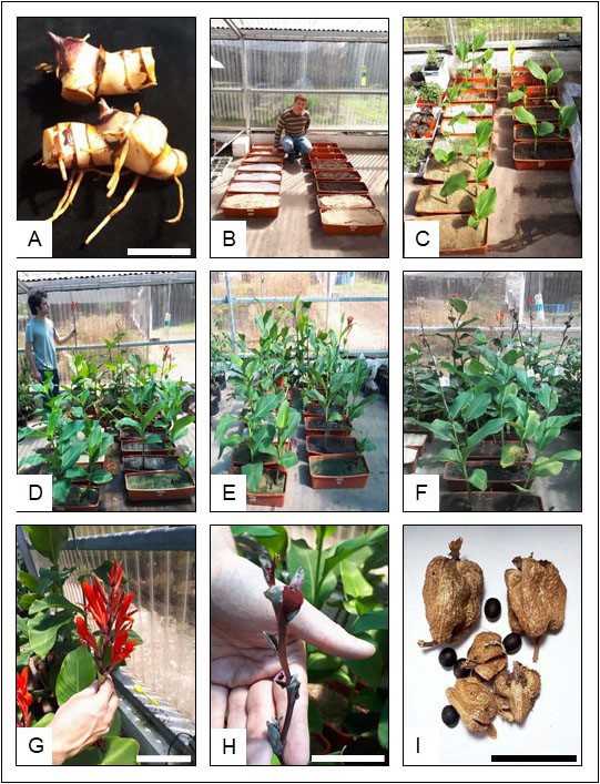 Figura 1. Etapas del ensayo de cultivo. A. fragmentos de rizoma para cultivo. B. Etapa inicial del ensayo (22-VIII). C. Crecimiento de las plantas (08-X). D. Crecimiento de las plantas (02-XI). E. Crecimiento de las plantas (12-XI). F. Crecimiento de las plantas (21-XI). G. Floración (01-XII). H. Comienzo de la fructificación (01-XII). I. Obtención de frutos y semillas a los (20-XII). Escala: 5 cm.