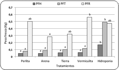 En el caso de los órganos subterráneos el comportamiento fue diferente; el mayor valor de PFR se observó en el tratamiento con vermiculita como sustrato, seguido de perlita e hidroponía; el valor más bajo de PFR se registró en arena con diferencias significativas con el tratamiento de vermiculita (Fig. 4).