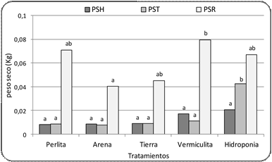 El PSH no presentó diferencias significati- vas entre los tratamientos (Fig. 5). Sin embar- go, el PST presentó mejor respuesta en plantas obtenidas hidroponía con diferencias signifi- cativas respecto al resto de los tratamientos (Fig. 5). Por otro lado, el PSR tuvo su valor más alto en el tratamiento con vermiculita, se- guido del tratamiento de perlita, hidroponía y tierra; solo se observaron diferencias signifi- cativas con el tratamiento de arena, que fue el más bajo (Fig. 5).
