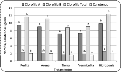 El contenido de clorofila a fue significativamente mayor en las plantas que crecieron en hidroponía, perlita y arena, respecto a las que crecieron en tierra y vermiculita (Fig. 6). Una respuesta similar se observó en el contenido de clorofila total y carotenos, mientras que el contenido de clorofila b fue significativamente mayor en hidroponía y perlita, respecto a tierra (Fig. 6).