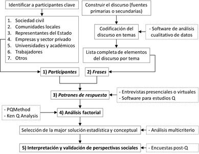 Un estudio Q se puede resumir en una serie de cinco pasos clave, de los cuales algunos son obligatorios pero otros pueden ser opcionales y seguirse sólo en casos específicos (Fig. 1) (ver Webler et al., 2009 y Sneegas et al., 2021, para más detalles). El objetivo de un estudio Q suele vincularse a un contexto específico o a una situación local que genera la necesidad de describir y entender mejor las diferentes perspectivas sociales existentes sobre un tema determinado. Muchas veces los estudios Q se han realizado con la idea de contribuir a la toma de decisiones, visibilizar la opinión de algunas minorías vulnerables, o reducir impactos o injusticias socioambientales asociadas a emprendimientos económicos o productivos. Los participantes de un estudio Q (Paso 1, Fig. 1) se eligen entre aquellos que tienen una opinión formada sobre el tema de estudio, tratando de reflejar la mayor amplitud posible de opiniones, por minoritarias que sean.