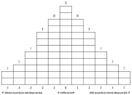 en la que los encuestados deben ordenar las frases en función de su grado de acuerdo o desacuerdo con ellas (ver ejemplo para 68 frases en la Fig. 2). La ubicación de las frases en las columnas es irrelevante, ya que todas las celdas de cada columna reciben la misma valoración. El punto cero de indiferencia o de “no relevancia” se llama también “cero distensivo”. El hecho de que se intente forzar una distribución cuasi normal se fundamenta en que esta forma ayuda a los participantes a revelar sus preferencias de manera más eficiente. En los estudios Q tradicionales, la grilla de respuesta y las tarjetas con las frases se imprimen y se acomodan físicamente en la grilla por cada participante. También existen softwares que permiten realizar este paso de manera remota. Los participantes de un estudio Q pueden mantener su anonimato, ya que sólo importa su afiliación a un determinado grupo social o de interés y no su identidad. Durante la entrevista también se pueden realizar preguntas para obtener justificaciones sobre la clasificación realizada y enriquecer luego la interpretación de las perspectivas sociales (Robbins, 2005).
