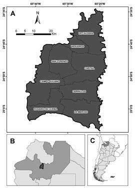 Figura 5. Municipios del Área Metropolitana del Valle de Lerma (A) en la provincia de Salta (B), Argentina (C).
