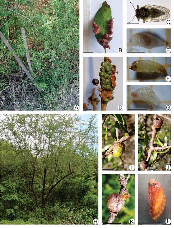 Figura 1. Schinus bumelioides. A. Arbusto. B. Hoja con agallas. C. Calophya duvauae. D. Detalle de rama con agallas multicamerales. E. Larva. F. Pupa. G. estado muy próximo al adulto de Dicranoses congregatella. Schinus pilifera. H. Arbusto. I. Rama con agalla inmadura. J. Agallas sin opérculo. K. Agalla con pupa. L: Pupa. Escala: B: 5 mm; C-E-F-G: 1 mm; D-I-J-K: 1 cm; L: 0,5 mm. Fotos: E. Lozano.
