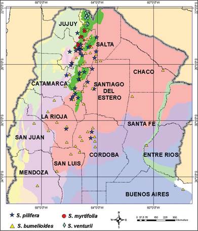 Para el estudio exomorfológico de las agallas se tomaron 10 ramas de diez individuos seleccionadas al azar en ambas especies, para la clasificación de las agallas se siguió a Isaías et al. (2013) y el agente que las produce determinado por la Dra. María Inés Zamar, integrante del Departamento de Entomología, perteneciente al Instituto de Biología de la Altura (INBIAL) dependiente de la Universidad Nacional de Jujuy (2023). Para la regionalización biogeográfica se consideró la propuesta de Cabrera (1976). Los ejemplares de S. bumelioides y S. pilifera fueron colectadas predominantemente en Selva pedemontana de Yungas, Provincia de las Yungas; en ambientes de Chaco occidental y Chaco serrano de la Provincia Chaqueña. Con menor frecuencia, se encontraron en la ecoregión entre la Provincia del Monte y Provincia puneña. Schinus bumeliodes registro una mayor distribución con individuos aislados en la Provincia del Monte, Provincia del Espinal y en el Chaco oriental de la Provincia Chaqueña.